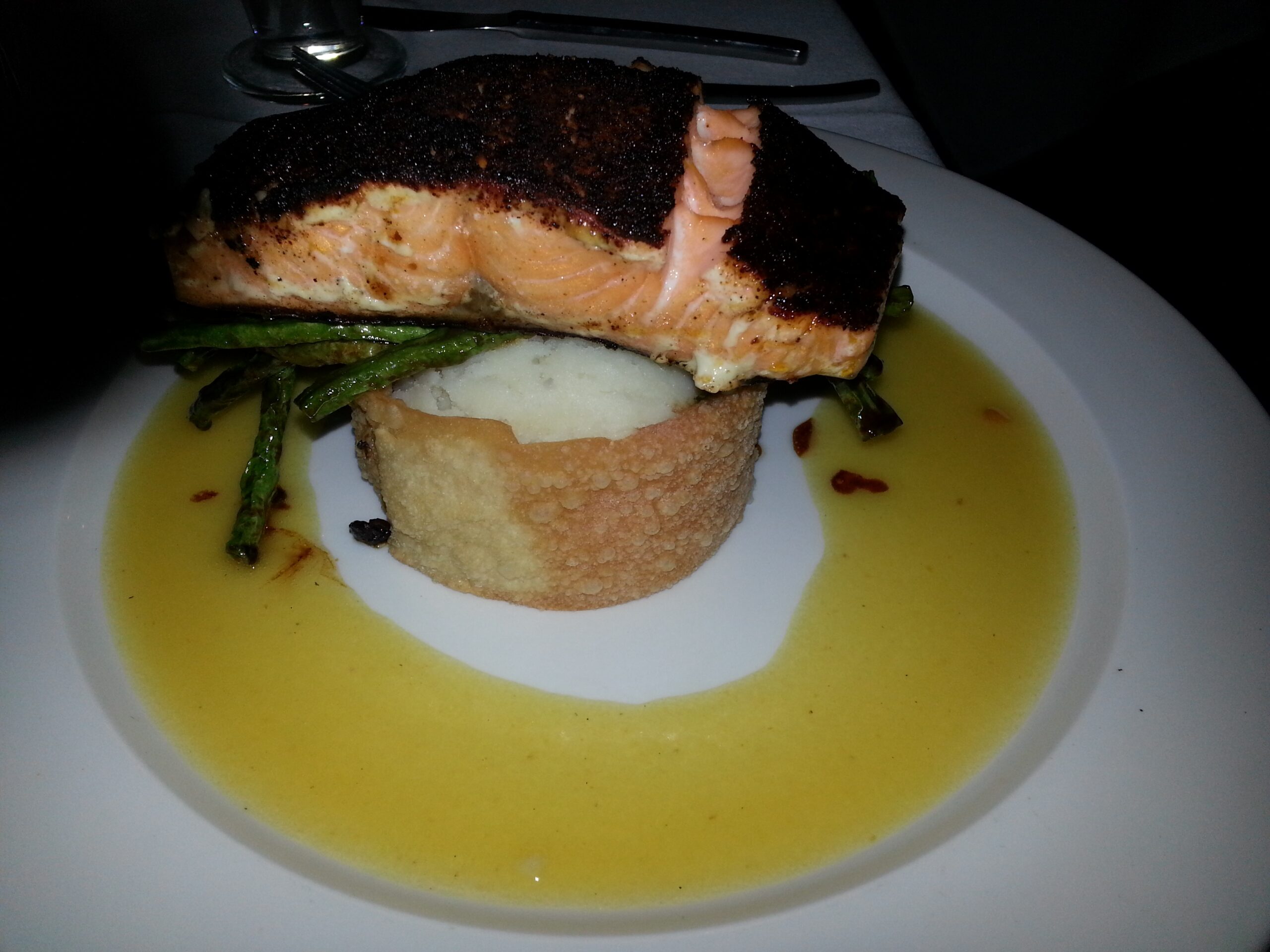 Black cod has a number of aliases, like “sable fish” and “poor man’s lobster” but a name change can’t hide the wonderful soft, smooth, flaky flavor. It is terrific with melted butter. My dish was marinated in a light Japanese miso that added great flavor. Squash puree and snow peas put it over the top.