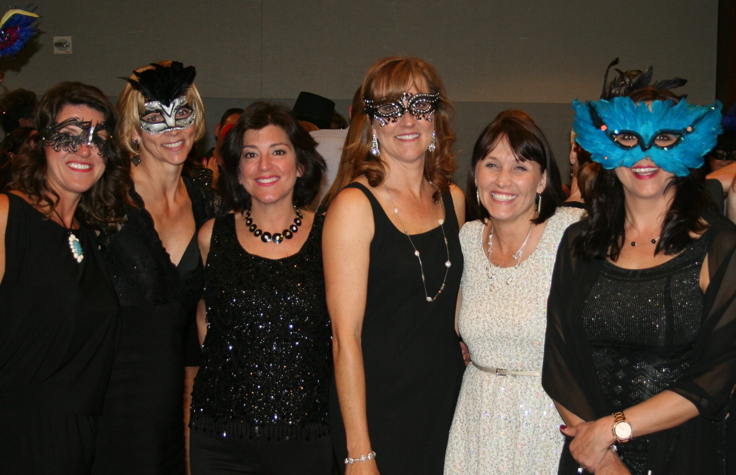 Silver Gate Elementary’s Masked Gala fundraiser attendees smile ear to ear—guests are happy to support education. L to R: Auction committee members Lisa Heffernan, Karen Sullivan, Nicole Sieger, and Julie Cegelski; Principal Sandy McClure, and Bernadette Cale.