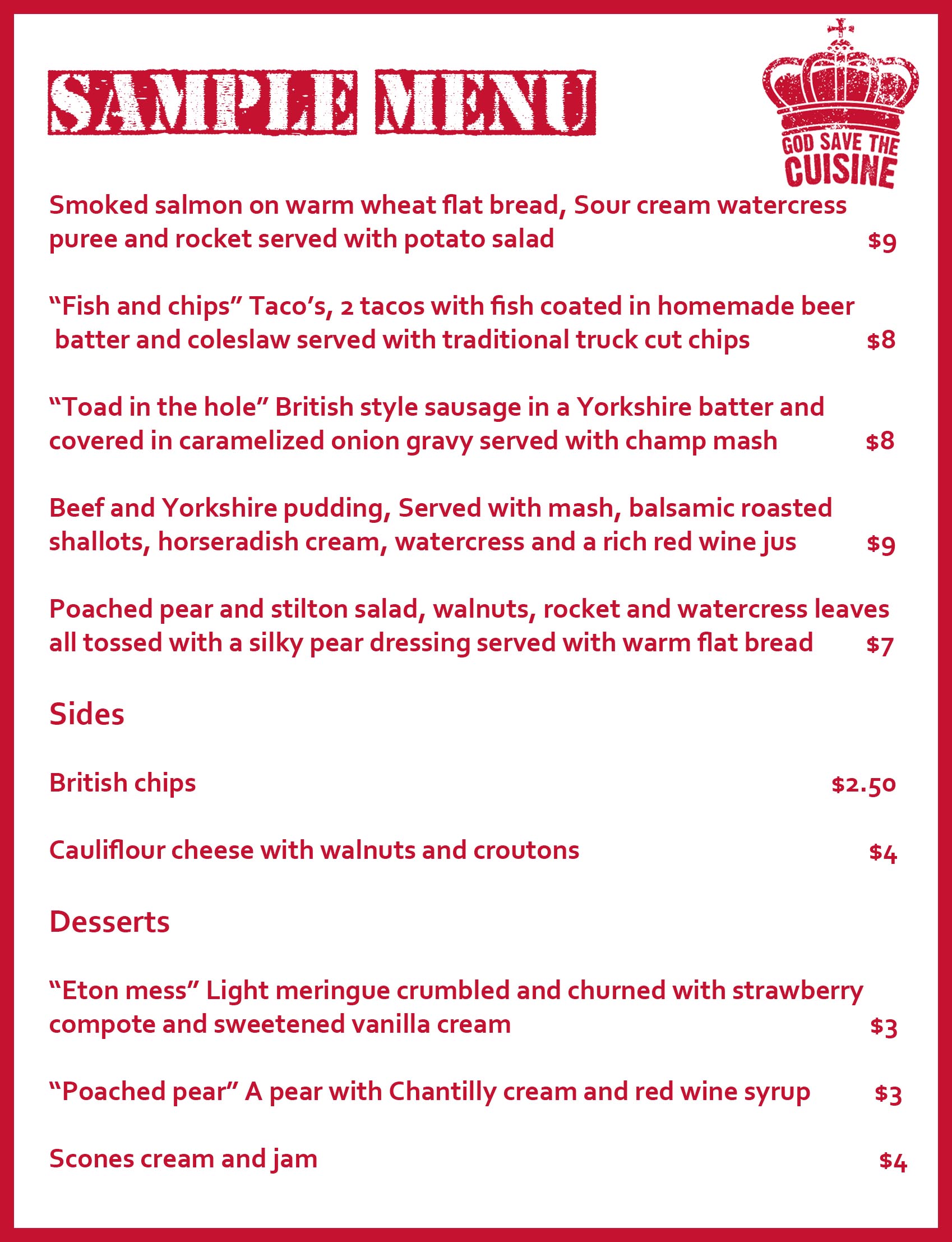 Besides “catering to the visual interests,” expect a British experience that includes the authentic “cockney” accents of the two owners, as well as some great British music from their truck (The Beatles, Oasis and Arctic Monkeys).