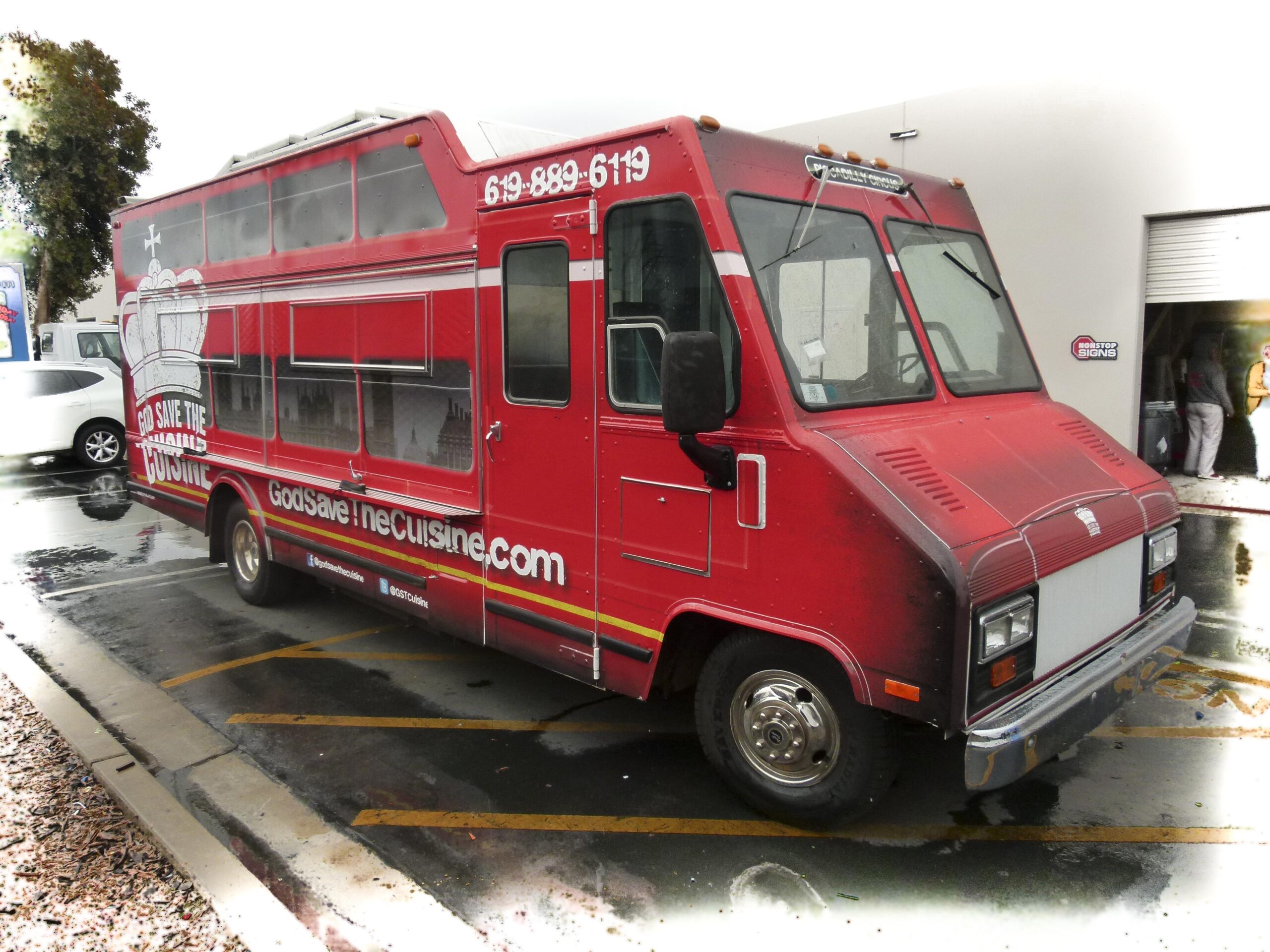Two brothers, Kevin and David Keylock, are introducing a British influenced gourmet food truck. Their mobile restaurant is styled after a London double decker bus, to separate them from most of the food trucks in San Diego. To make their vehicle more visual, they have added a seven foot wax British guard that will be on display every day.