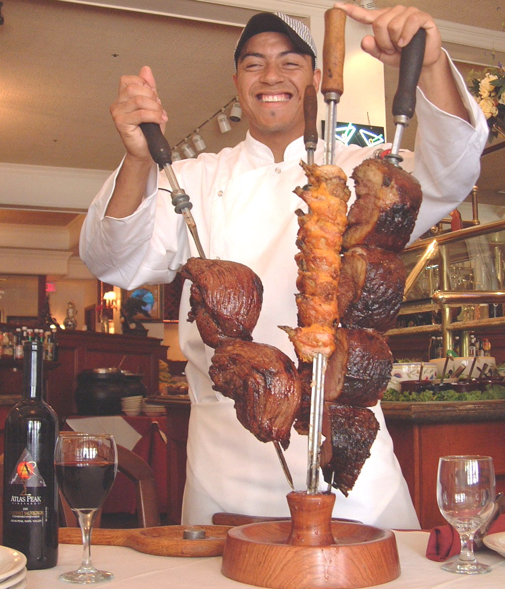 Charruscaria restaurants – and many have become very popular in the United States in the last ten years – serve food based on the diets of the “gauchos”, the cowboys of South America. They ate lots of meat, because it was all around them. Cowboys were usually accompanied by a “chuck wagon”, and a cook would prepare meals. Gauchos barbequed their meat on spits. The style of cooking was called Churrasco (pronounced shoo-RAS-koo) or Brazilian barbecue.