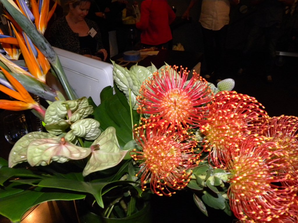 For this demonstration, Northcote chose bird of paradise as his first material. He added orange Protea with some green leafed stems (again in bunches) directly across from the bird of paradise. Continuing with the same color scheme, Northcote’s next addition was a clump of exquisite chartreuse anthurium flowers with bright red-orange stamens. Large leaves of philodendron lay across from the anthuriums.