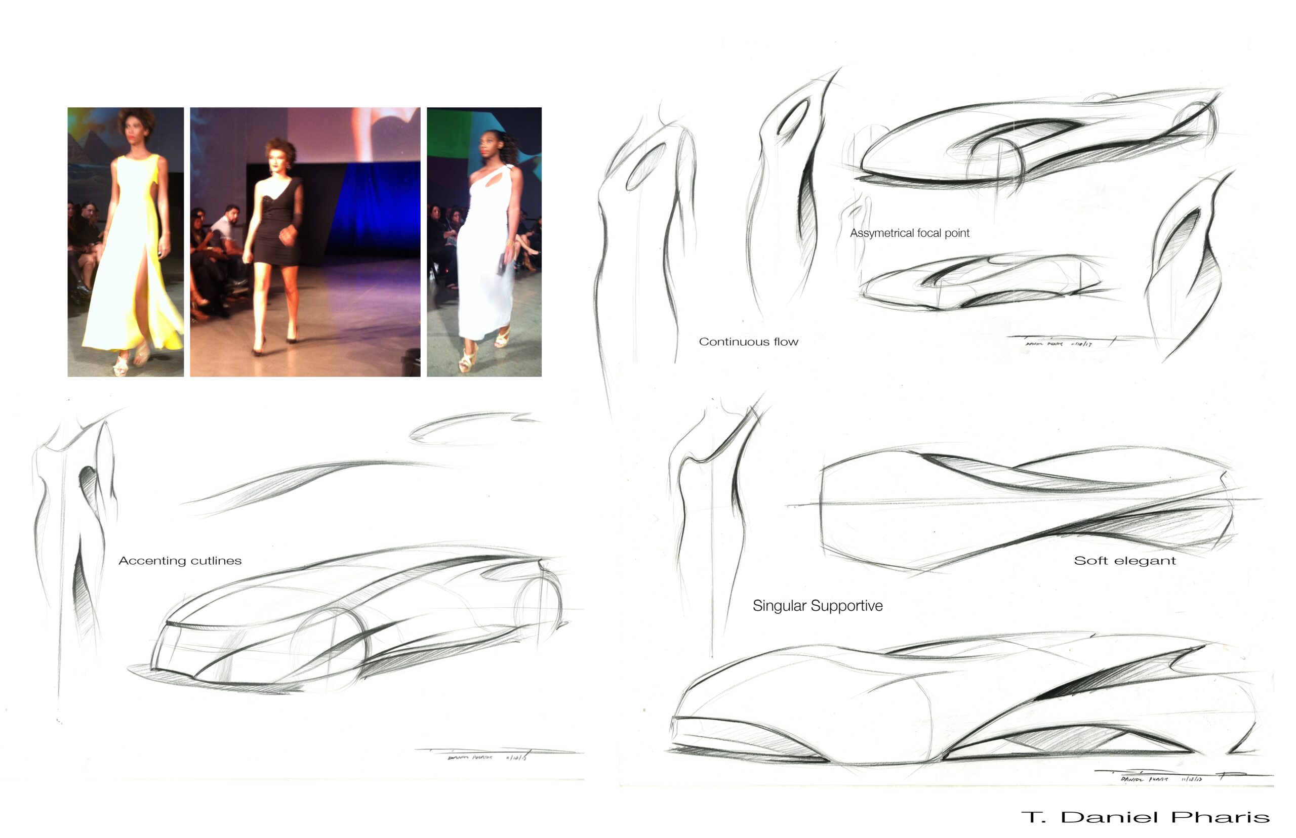 “These are sketches I did for Fashion Week. I took the form of the fabric and feel of what it was doing and slowly emulated it into a vehicle sketch. I first like to observe the design. I figure out whether it is soft or angular, flowing or rigid. I then figure out what the form is doing by sketching it and extracting it into ‘volumized’ proportions. It’s important to keep the essence of the inspiration, so I try to implement features and main character lines, while also paying close attention to feel of the sketch itself.”