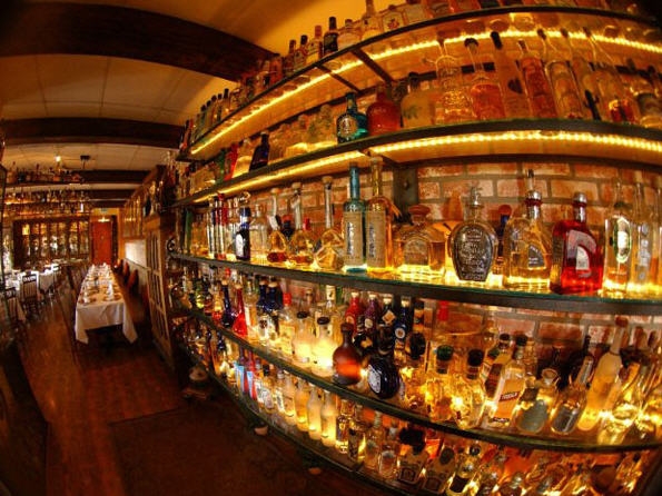 Guests ascend a flight of stairs to enter the main dining room, a large room surrounded by shelves that glitter with the reflections of varying shaped bottles. The room is dark and comfortable. An enclosed patio leads off the dining room, filled with regular and high rise tables that look out onto Old Town’s main street.