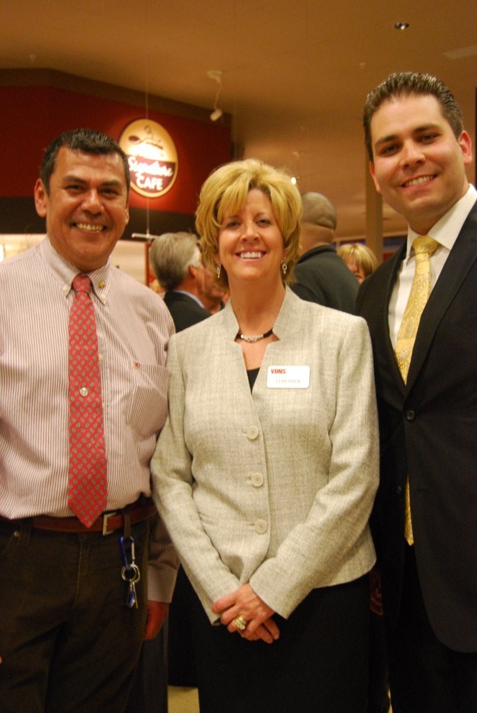 Arnaldo Cordero (left) is returning to the Vons Mission Hills/Hillcrest Store. He is pictured with Lori Ray, Vons president, and Gilbert Gonzales, director of public relations and government affairs.