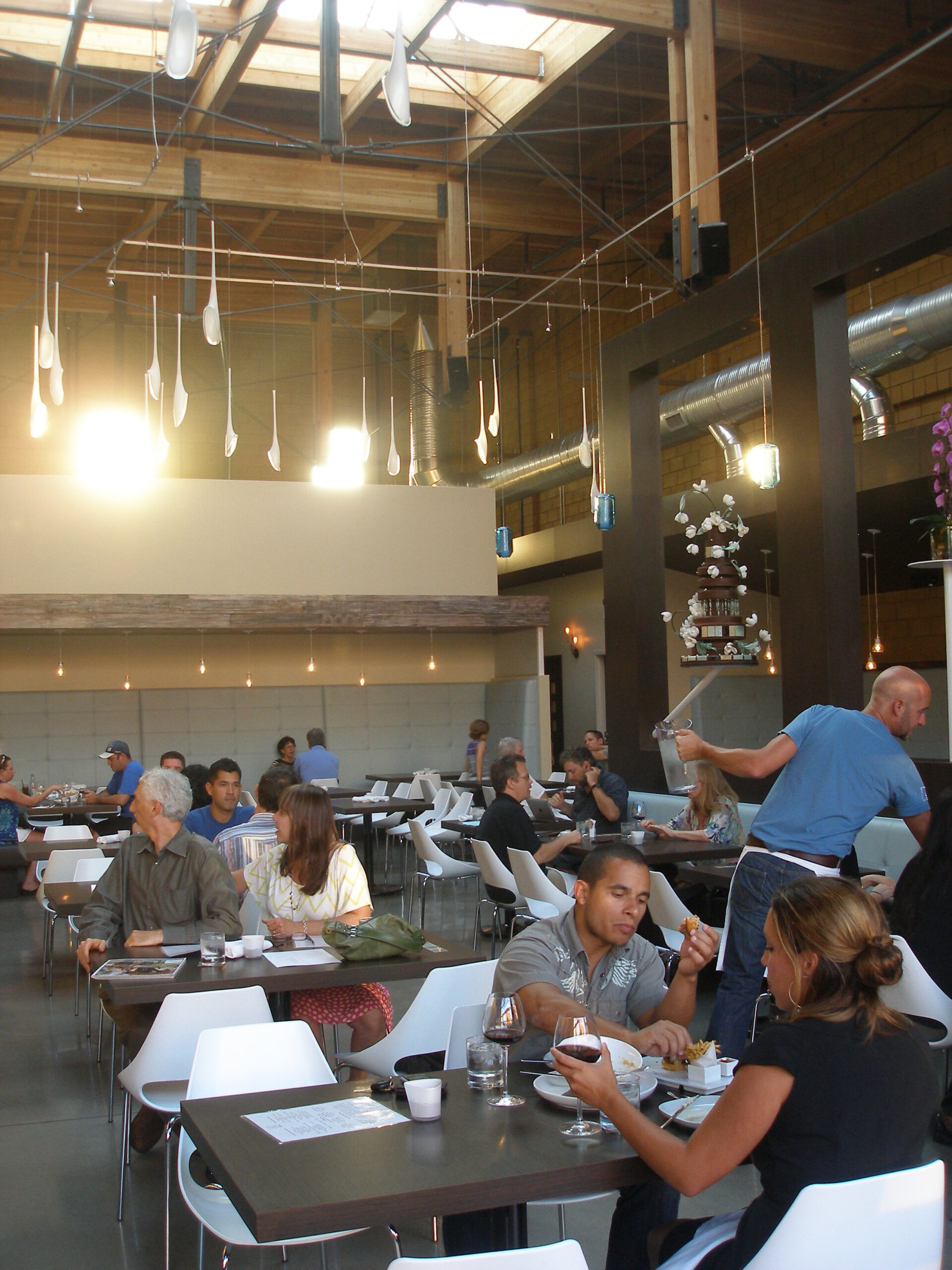 The large restaurant is beautifully, if simply, designed. The clean, long lines and enormously high ceilings create a sense of volume and space, accented by pleasing colors. A skylight illuminates the ceiling. Large windows in front bring in more light and can be raised up in the evenings so that the whole front of the building is open to cool evening breezes. A welcoming bar runs along one side of the interior and a long “open” dessert kitchen runs along the other. The comfortable patio near the front door is “pet friendly.”